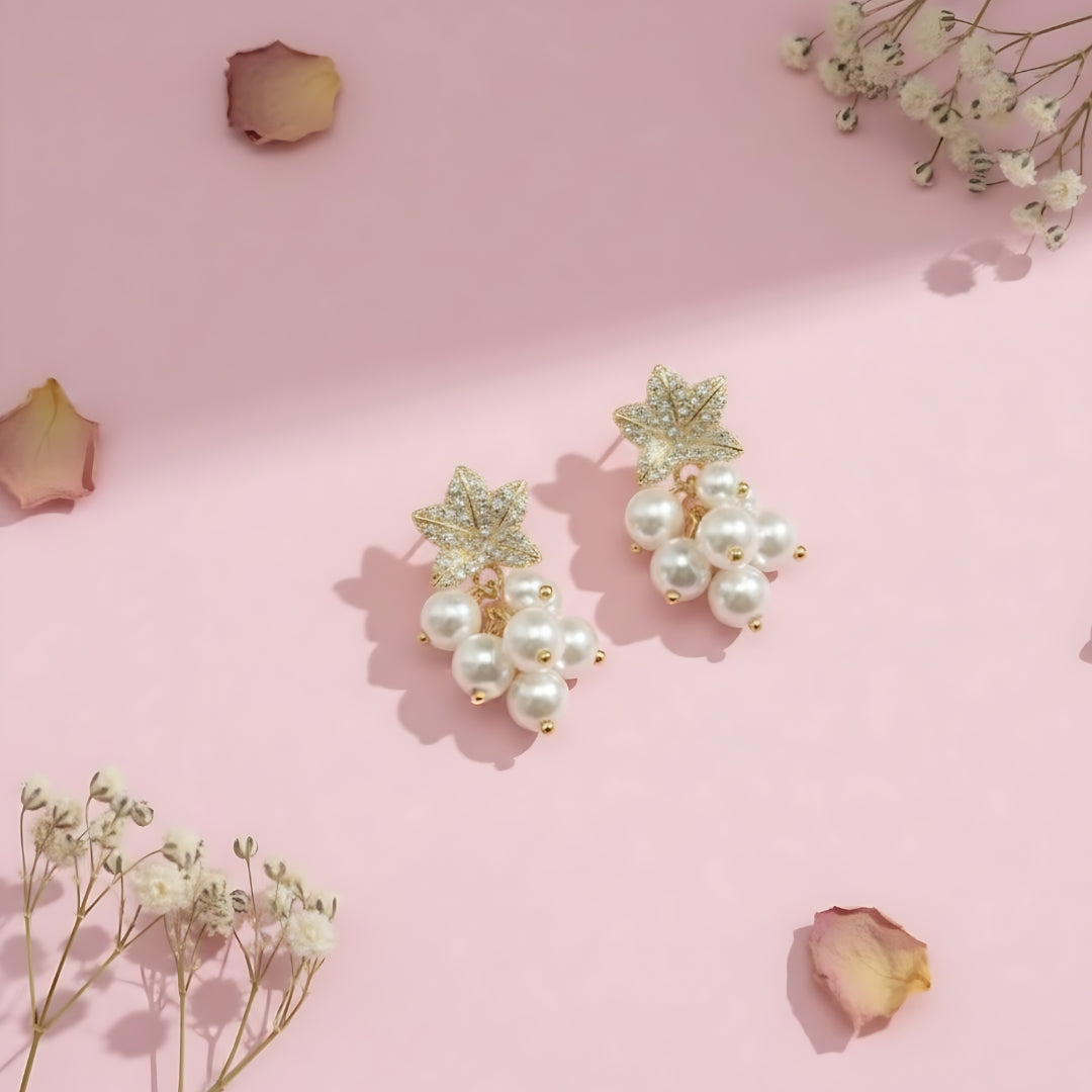 Embrace elegance with these gold leaf pearl cluster earrings featuring a sparkling leaf-shaped top set with brilliant cubic zirconia and cascading lustrous pearl drops. Perfect for weddings, festive occasions, and luxury evening wear, this nature-inspired design adds instant glamour and sophistication to any outfit. Lightweight and comfortable, these statement earrings are a must-have addition to any jewelry collection.