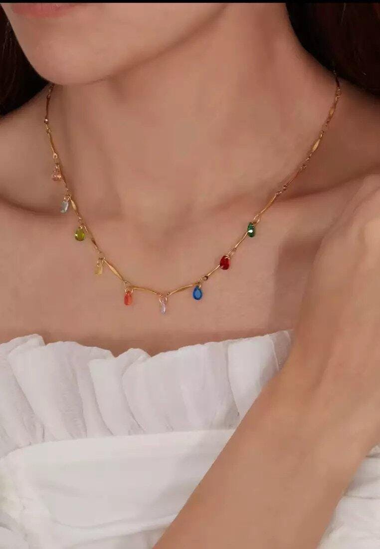 Elevate your look with this dainty anti-tarnish necklace featuring vibrant multicolor drop charms on a sleek gold-tone chain. Crafted with long-lasting, water-resistant plating, this necklace stays brilliant and resists fading—making it perfect for daily wear and effortless style in every season.