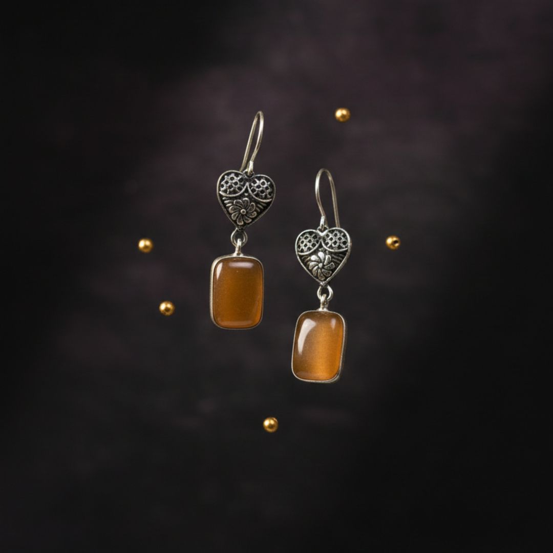 Add a warm, vintage charm to your look with these antique silver heart drop earrings, beautifully accented with smooth honey-amber rectangular stones. The intricately detailed heart motifs bring a romantic, handcrafted feel, while the amber-toned stones add a soft glow and timeless elegance.