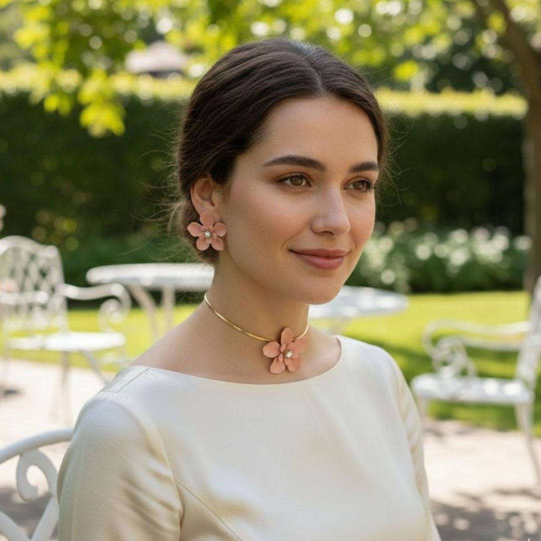 This blush pink floral necklace and earring set features delicate 3D flowers with sparkling stone centres, creating a soft, feminine statement for parties, weddings and festive occasions. The lightweight design makes it comfortable for all‑day wear, while the coordinated gift box presentation makes it a perfect jewellery gift for women and girls.