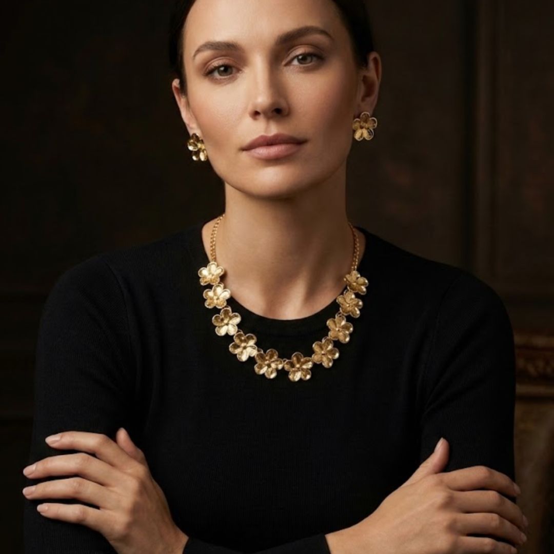 Elegant necklace set featuring a row of delicate gold plated five-petal flowers paired with matching floral stud earrings.
