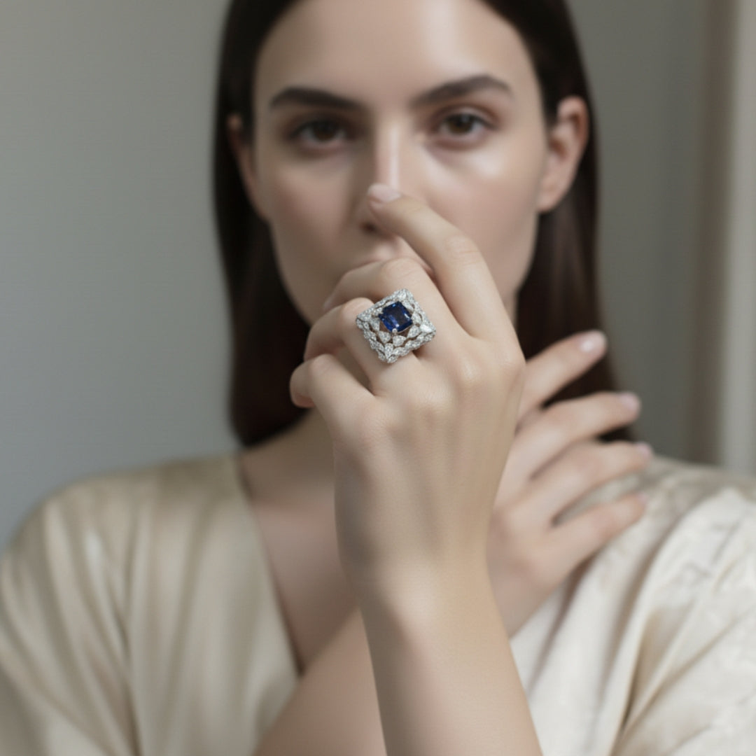 Commanding attention with its bold square design, this AD (American Diamond) cocktail ring features a regal blue stone at its center, encased by a lattice of brilliant pear-cut AD crystals. The intricate openwork and luxurious sparkle evoke a sense of royalty and sophistication, perfect for evening events or celebrating life’s grandest moments with unmatched glamour.
