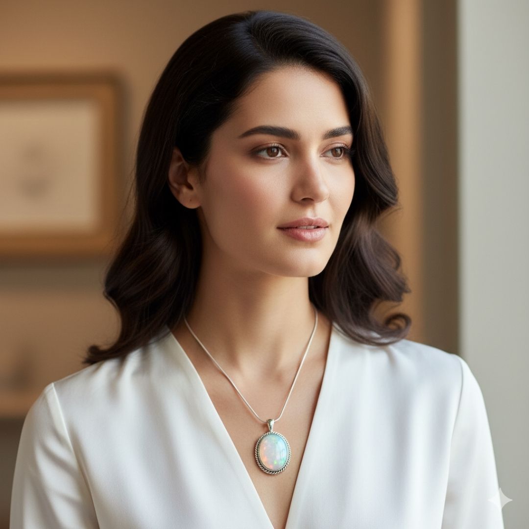 Soft, dreamy and luminous — this oval moonlight opal pendant reflects subtle rainbow hues with every movement. Set in handcrafted German Silver with a vintage twisted bezel, it adds effortless elegance to any look.