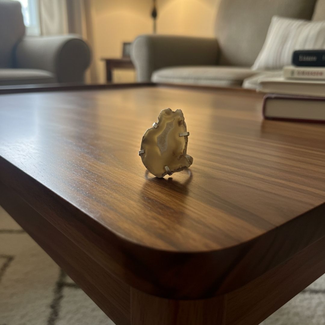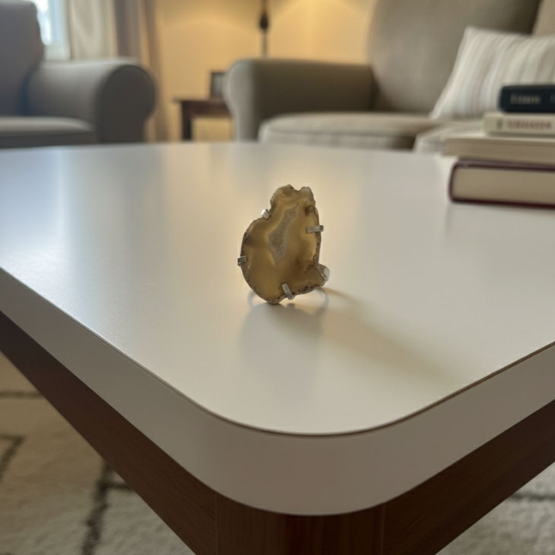 This statement ring features a raw-cut natural agate slice, preserved in its organic form and set in an oxidised silver-tone metal frame. The unique patterns and earthy tones of the stone make each piece one of a kind, celebrating the beauty of nature in its purest expression. The oxidised finish adds a vintage, handcrafted charm, making this ring a standout accessory for bohemian, contemporary, and artisanal styles. Perfect for those who appreciate bold designs, natural stones, and timeless craftsmanship.