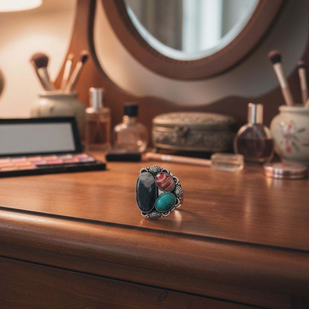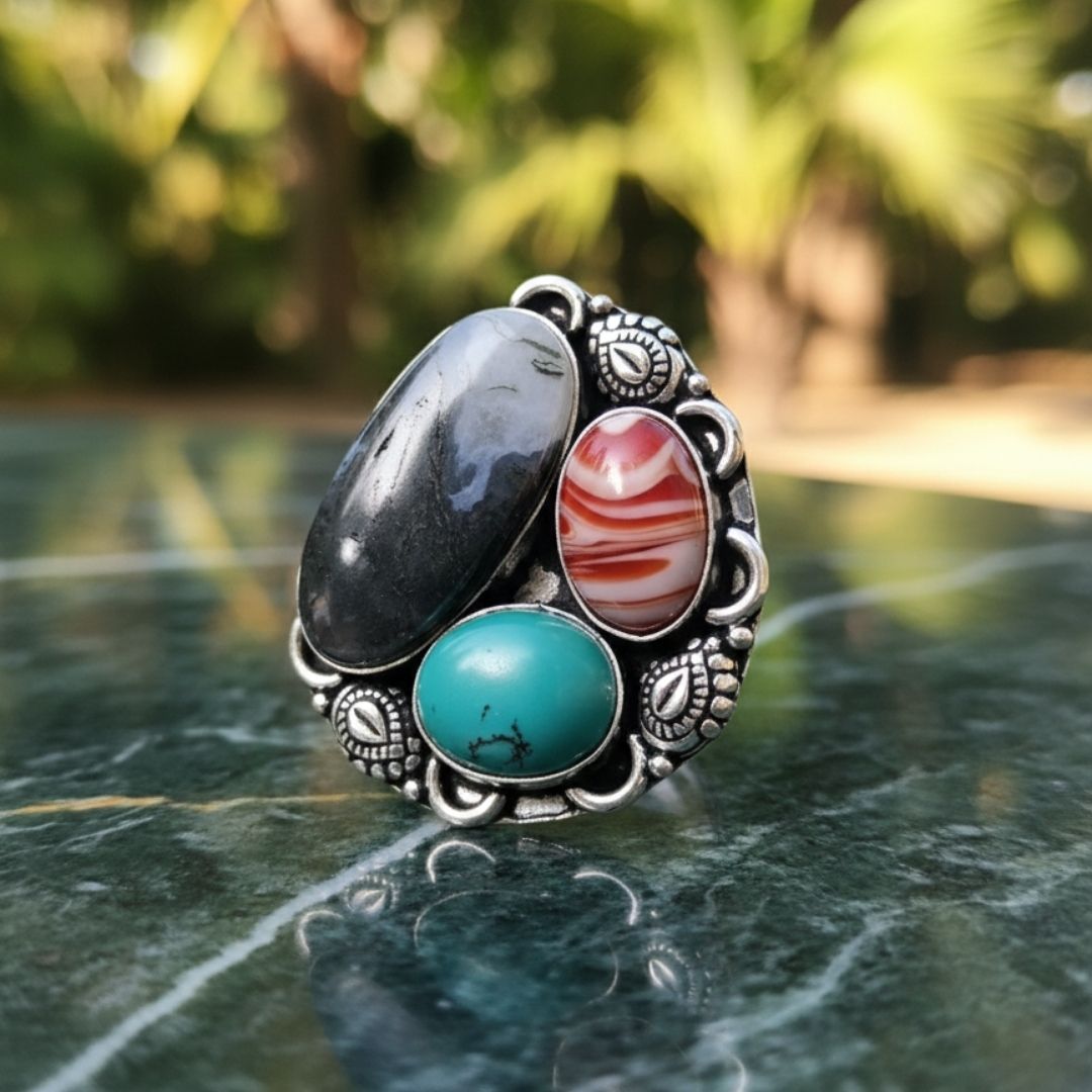 Bold oxidised silver ring featuring natural multi-stone detailing with an artistic finish. Handcrafted, unique, and perfect for boho and ethnic looks.