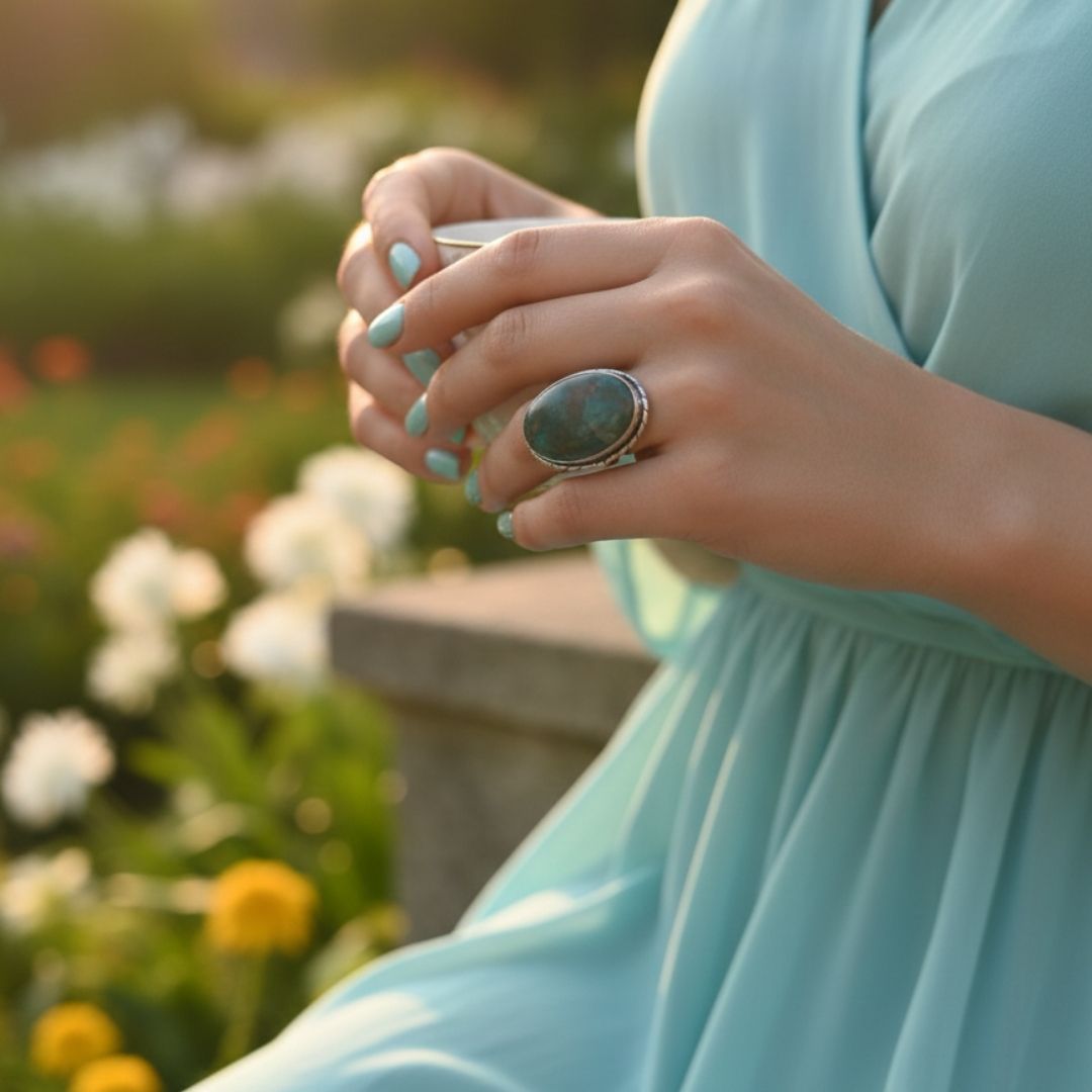An earthy blue-green oval stone with natural veining, set in an oxidised silver frame. Inspired by ocean depths and raw textures—perfect for bold yet grounded styling.
