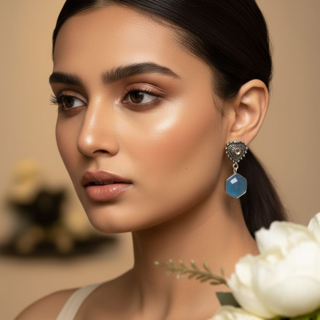 Elevate your everyday elegance with these oxidised silver drop earrings, featuring a serene blue stone that adds a soft pop of color. The intricately detailed stud top pairs beautifully with the faceted geometric drop, creating a balanced blend of traditional craftsmanship and modern design.