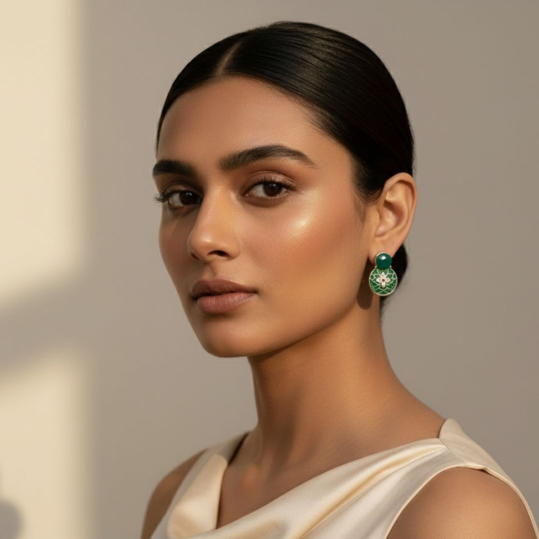 Refresh your accessory collection with these oxidized floral stud earrings, featuring a deep green enamel base adorned with hand-painted white and pink flowers. The oxidized metal back offers both durability and a traditional touch, while the bold round green top stone makes these a standout for festive, ethnic, or fusion styles. Perfect for daily elegance or special celebrations.
