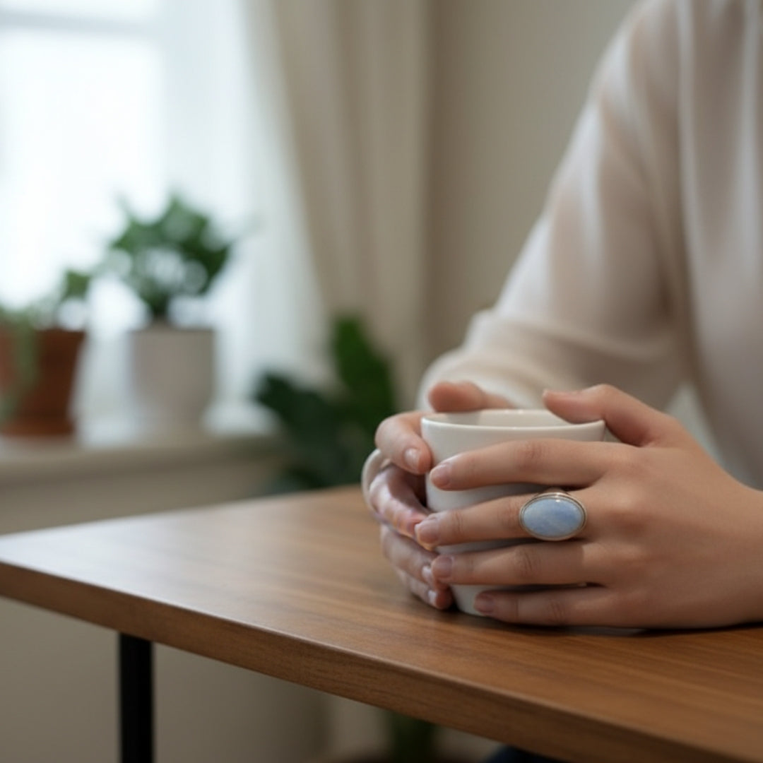 This elegant ring showcases a serene blue chalcedony oval, set in a minimalist oxidized silver band that emphasizes the calm, pastel hues of the stone. The sleek bezel setting and artisan finish create a refined statement piece that balances modern sophistication with everyday versatility. Perfect for those who appreciate subtle style and handcrafted jewelry artistry.