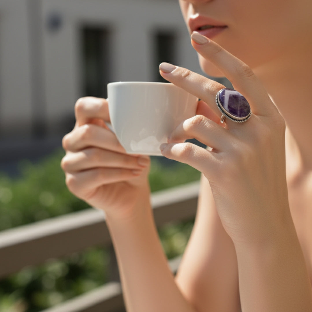 Featuring a mesmerising chevron-patterned amethyst cabochon, this oxidized silver oval ring blends vintage elegance with modern artistry. The deep purple gemstone is accentuated by the rope-style bezel setting, highlighting natural geometric striations and subtle antique patina. Perfect for those drawn to unique gemstones, statement accessories, and intricate handcrafted details.