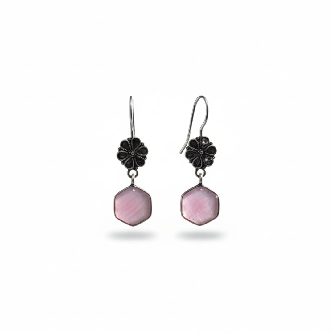 Oxidized Silver Floral Earrings with Pink Hexagon Stone Drop