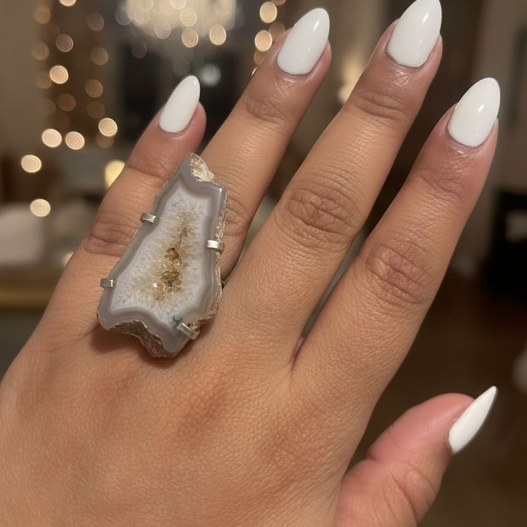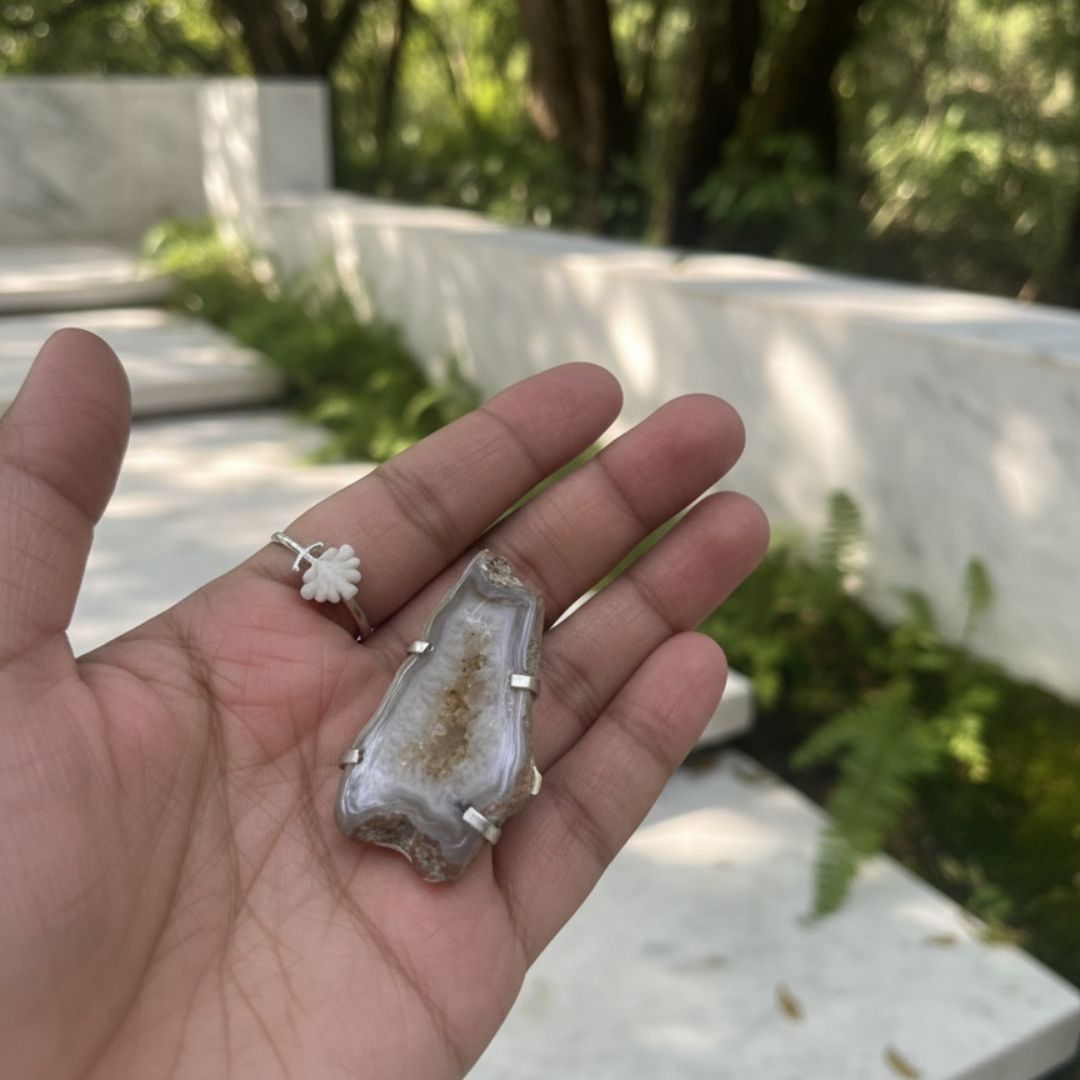 This handcrafted pendant features a natural raw druzy agate, celebrated for its crystalline texture and organic form. Secured in an oxidised silver-tone setting, the stone’s natural layers and sparkling druzy center are beautifully highlighted. Each pendant is unique in shape and pattern, making it a one-of-a-kind piece. The oxidised finish adds a rustic, artisanal character, perfect for bohemian, earthy, and contemporary styles. An ideal accessory for those who appreciate raw gemstones, natural beauty, and handcrafted design.