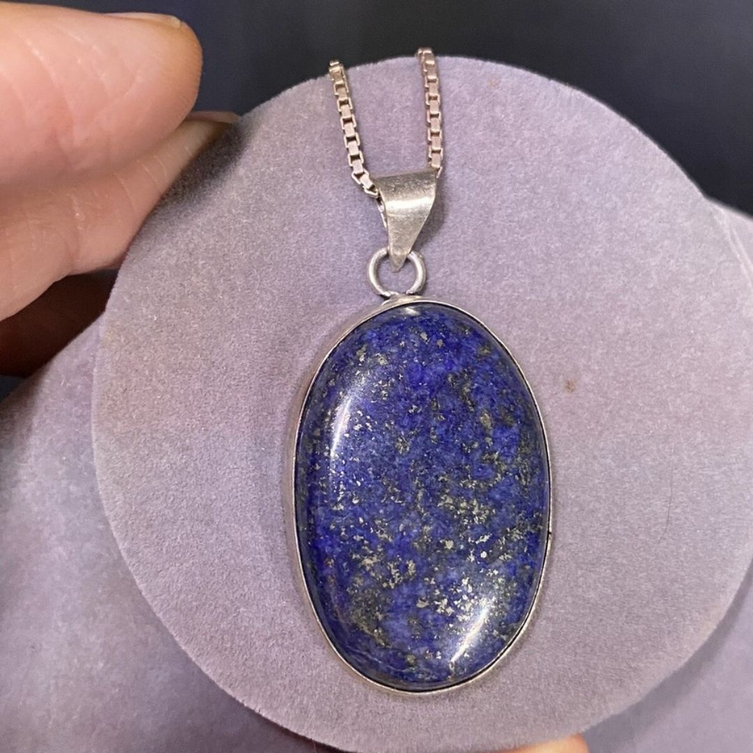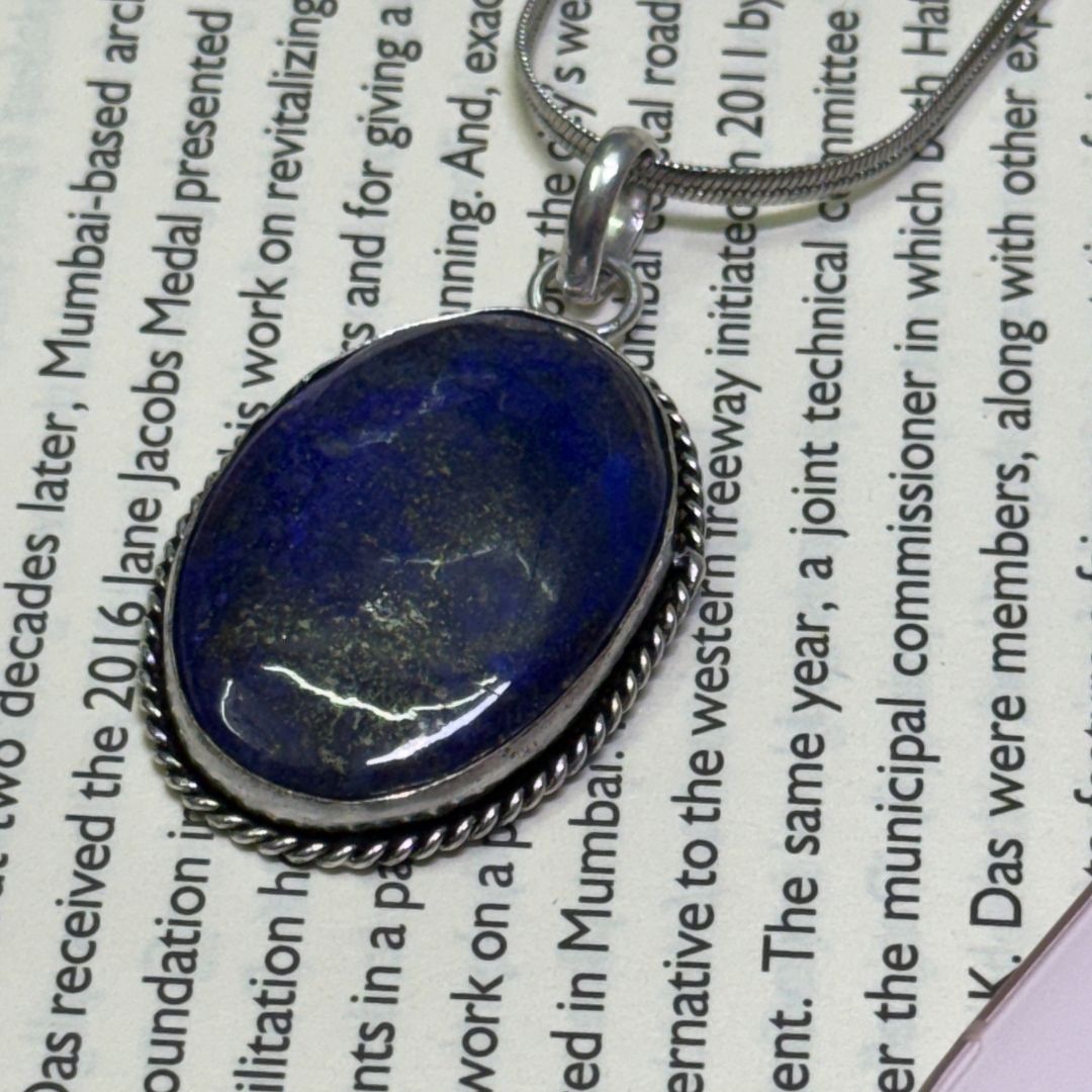 This striking deep blue oval stone pendant exudes confidence and regal charm. Framed in detailed German Silver, it’s designed to stand out while remaining effortlessly elegant.