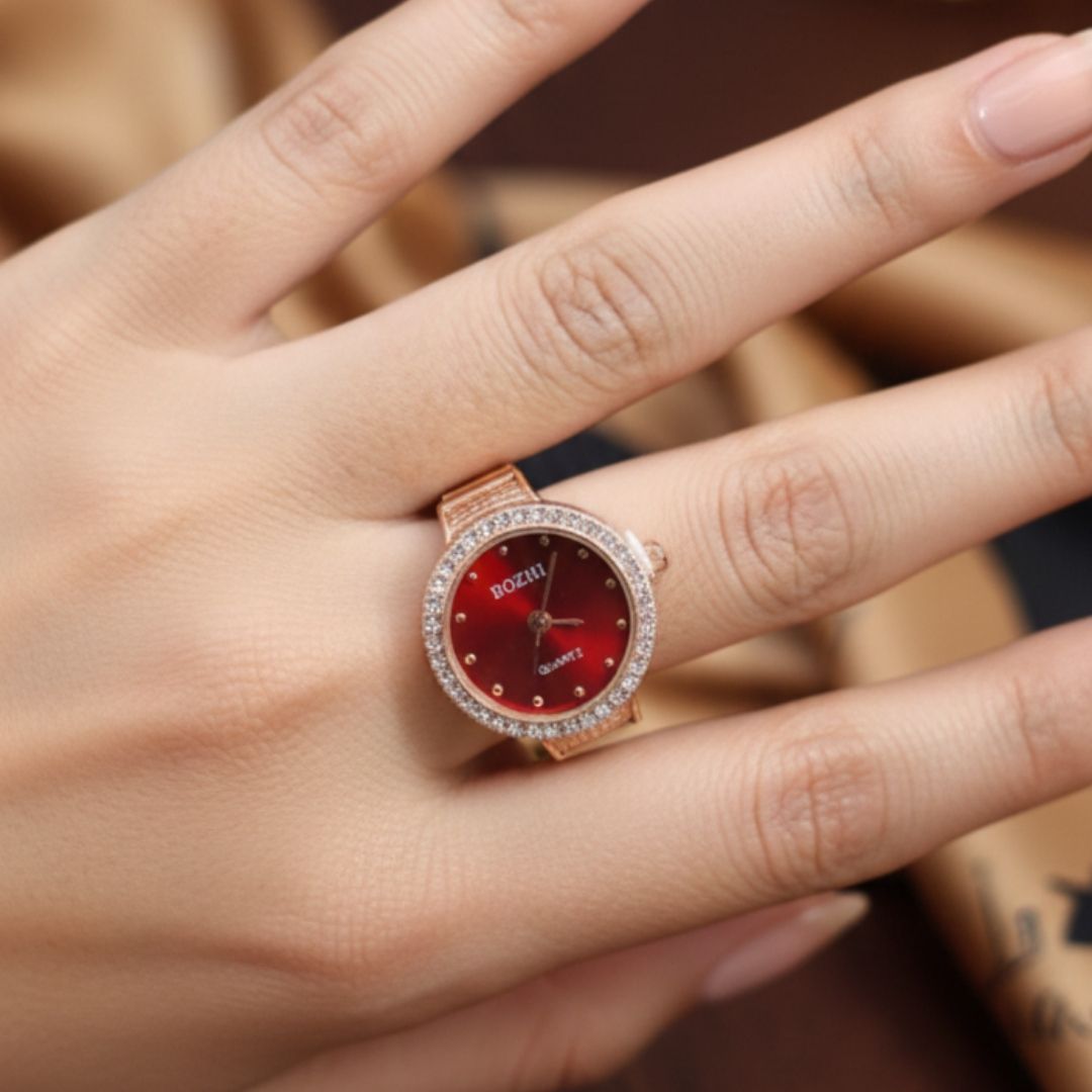 Make a bold and elegant statement with this royal ruby dial ring, designed in a rich rose gold finish and framed with shimmering American Diamonds. The deep red dial adds a touch of timeless luxury, making it the perfect accessory for evening wear and special occasions.